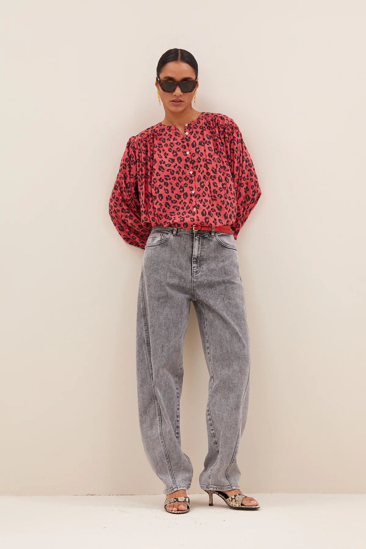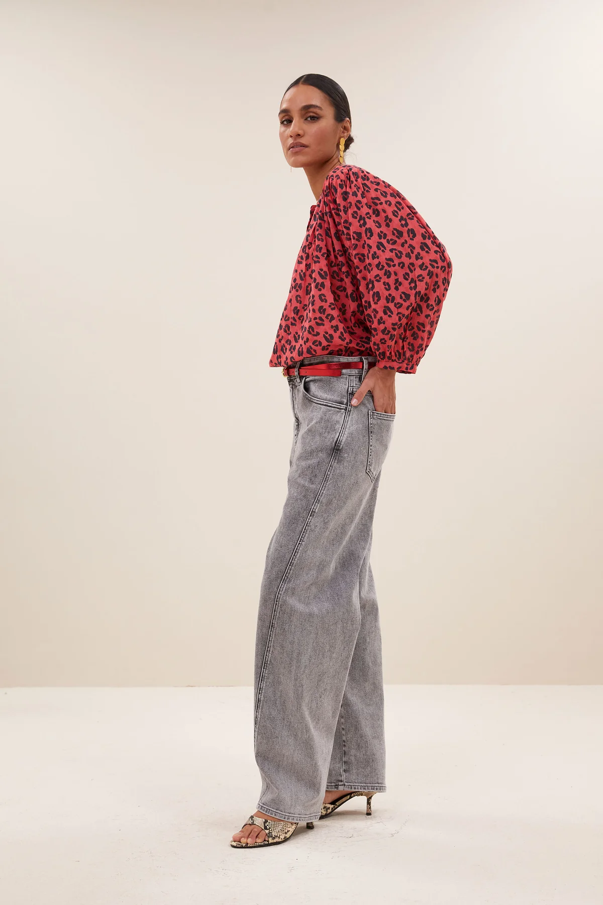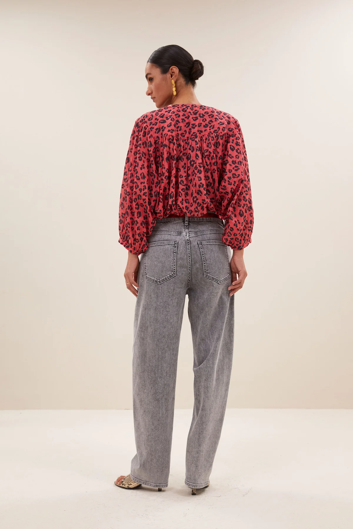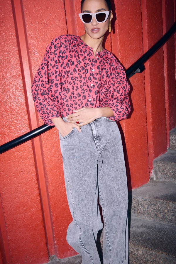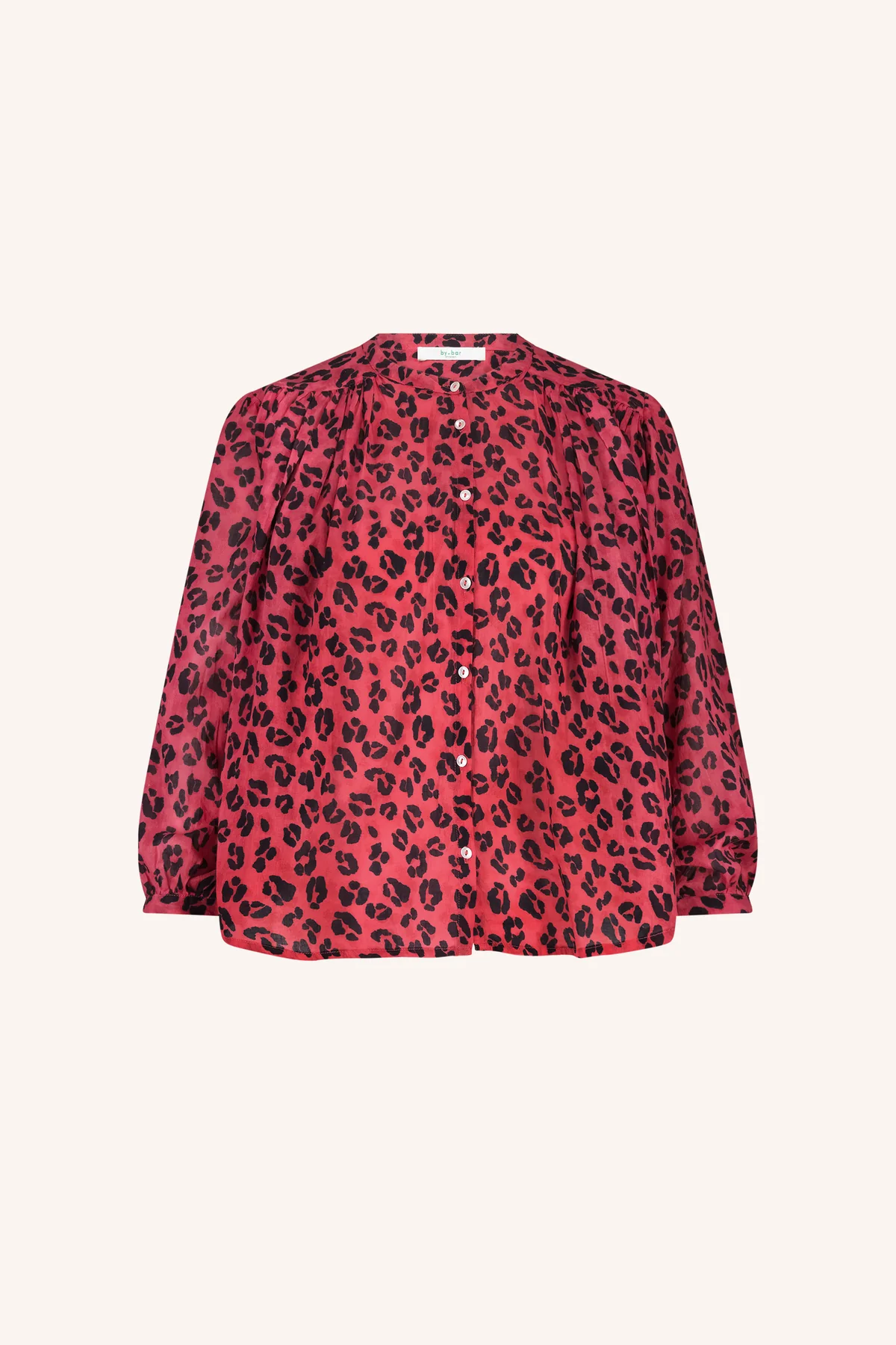La blusa becky red cheetah tiene un escote redondo, un cierre con botones y un corte boxy. Las mangas voluminosas, los pliegues y la tela ligeramente transparente le dan a la blusa un aspecto casual elegante. Esta blusa ofrece comodidad y estilo para todos los días. ¡Perfecta para un look relajado y a la moda!
