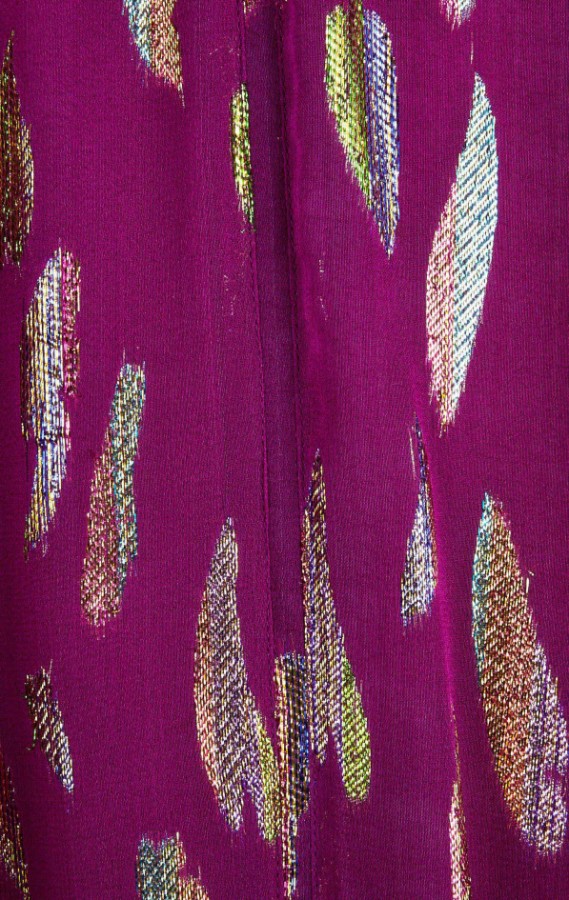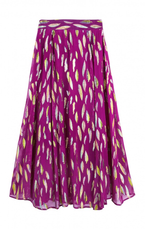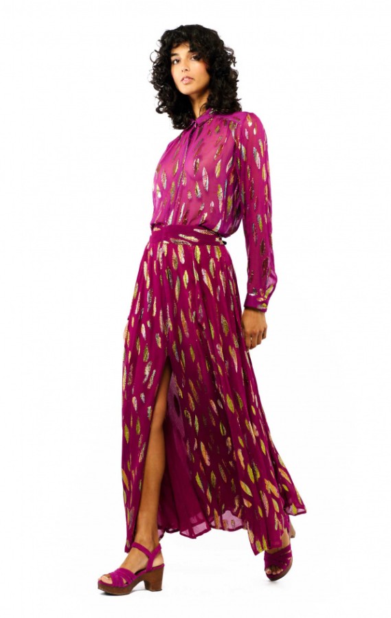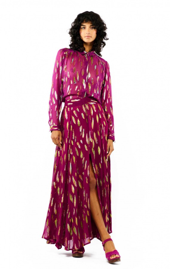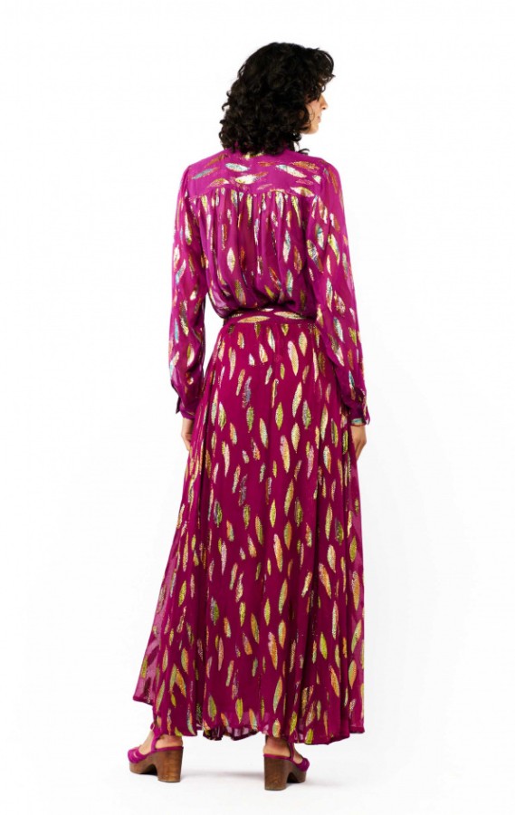 Forrado para evitar transparencias y confeccionado en viscosa jacquard, se abre por delante, dejando las piernas libres con un toque muy femenino. Su cinturón de parche y su diseño acampanado en la parte delantera y trasera realzan la silueta con elegancia. Sublimado por un intenso color fucsia, es también una prenda muy luminosa gracias al bordado de hilo de lúrex dorado.