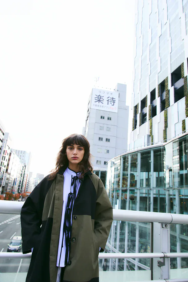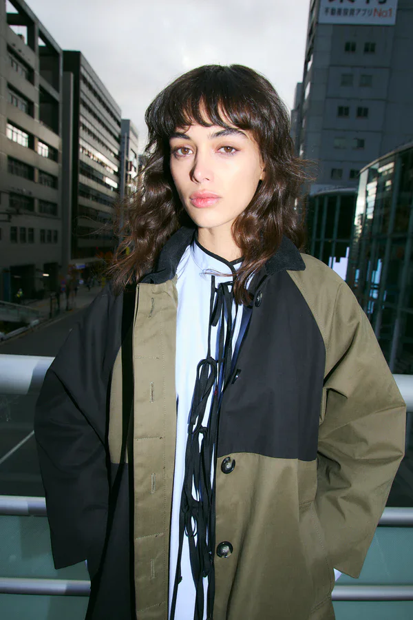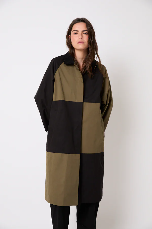 Gabardina midi confeccionada en bloques de color verde caqui y negro con diseño geométrico. De corte recto y holgado, presenta cierre frontal oculto y bolsillos laterales.