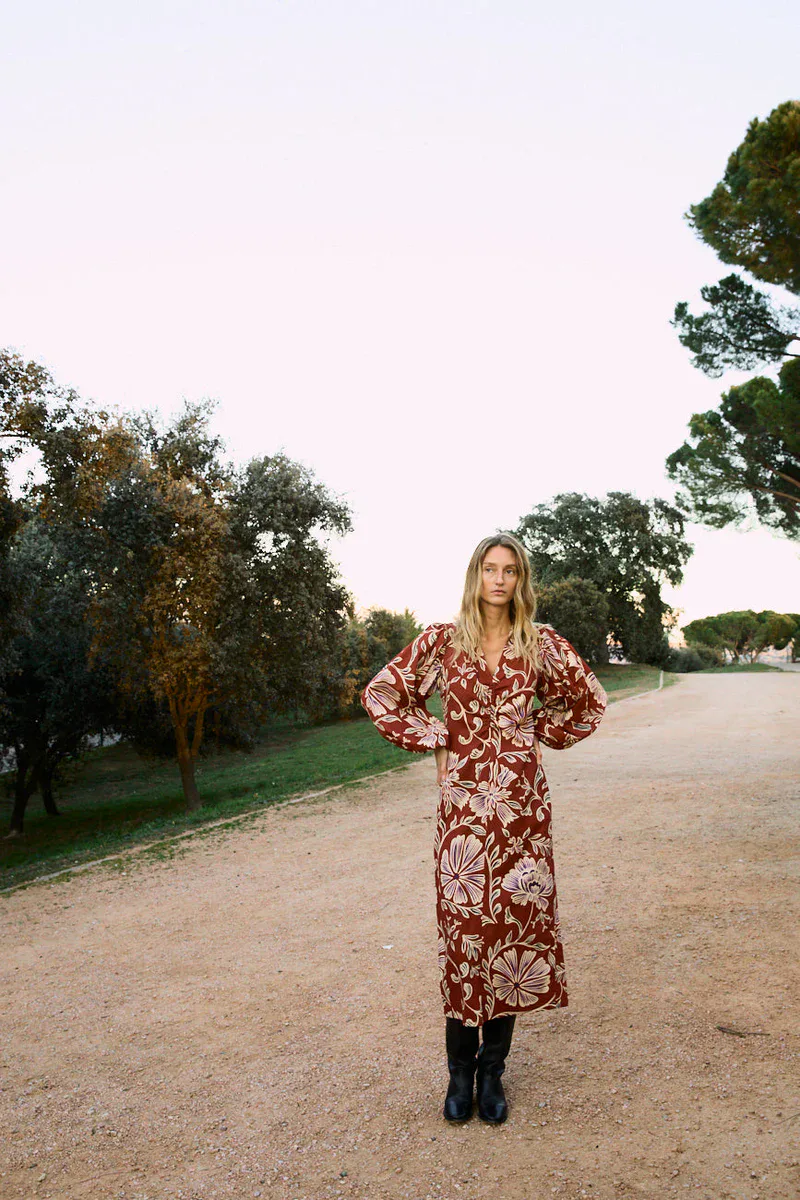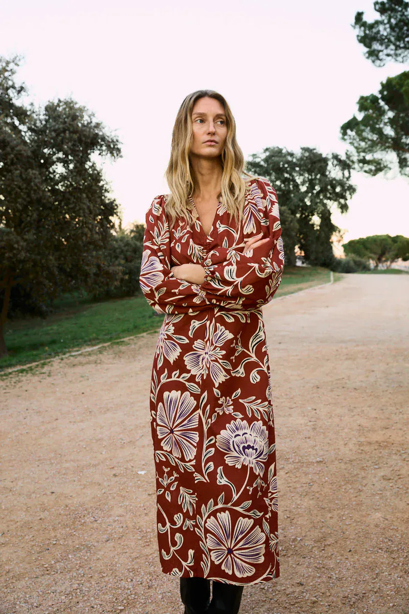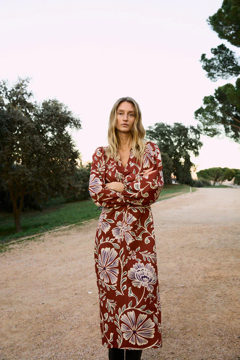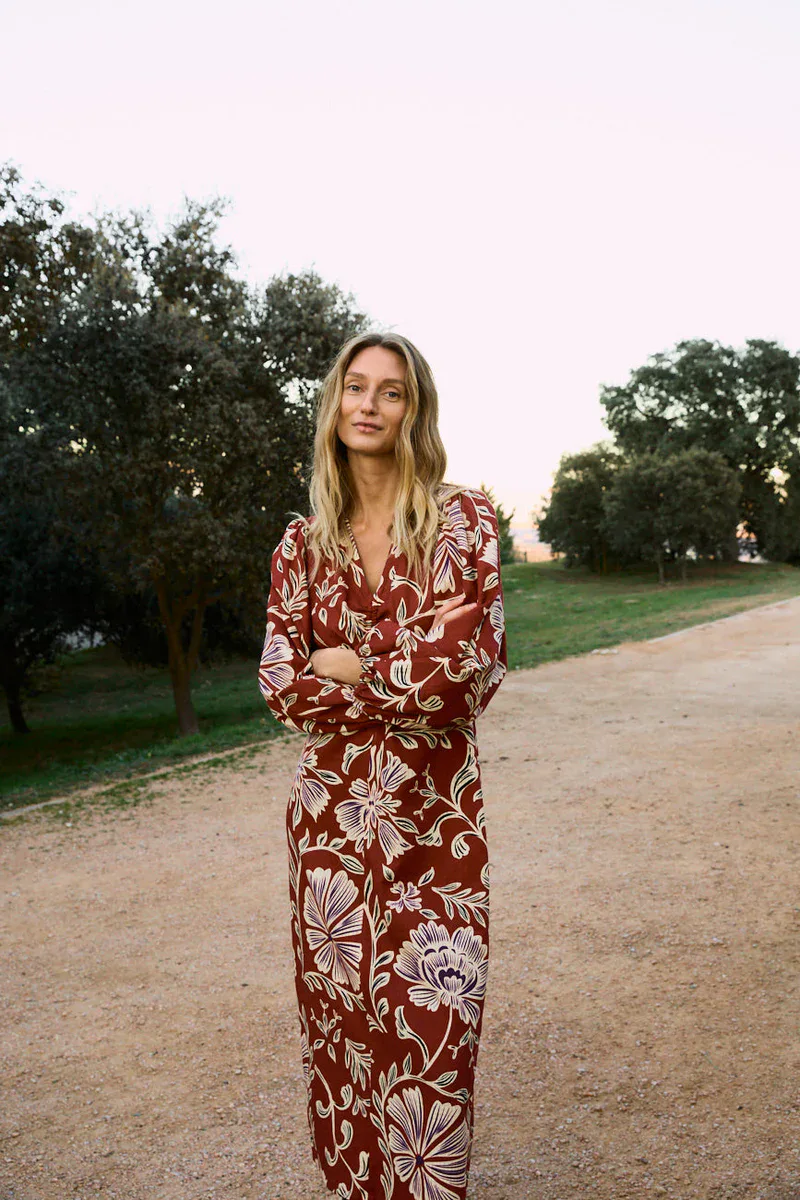 Vestido largo, escote pico con detalle fruncido. Manga amplia abullonada larga. Cierre en espalda con cremallera.